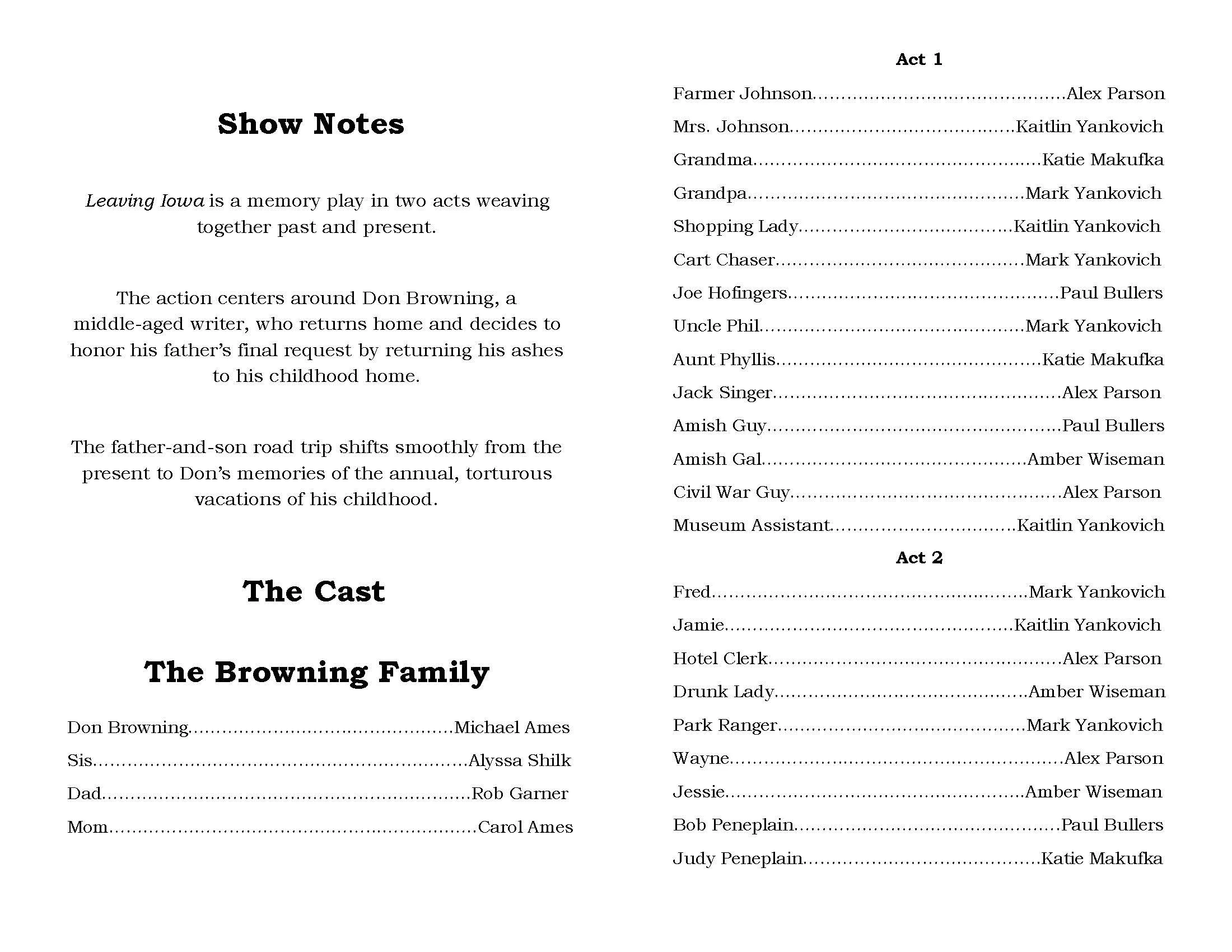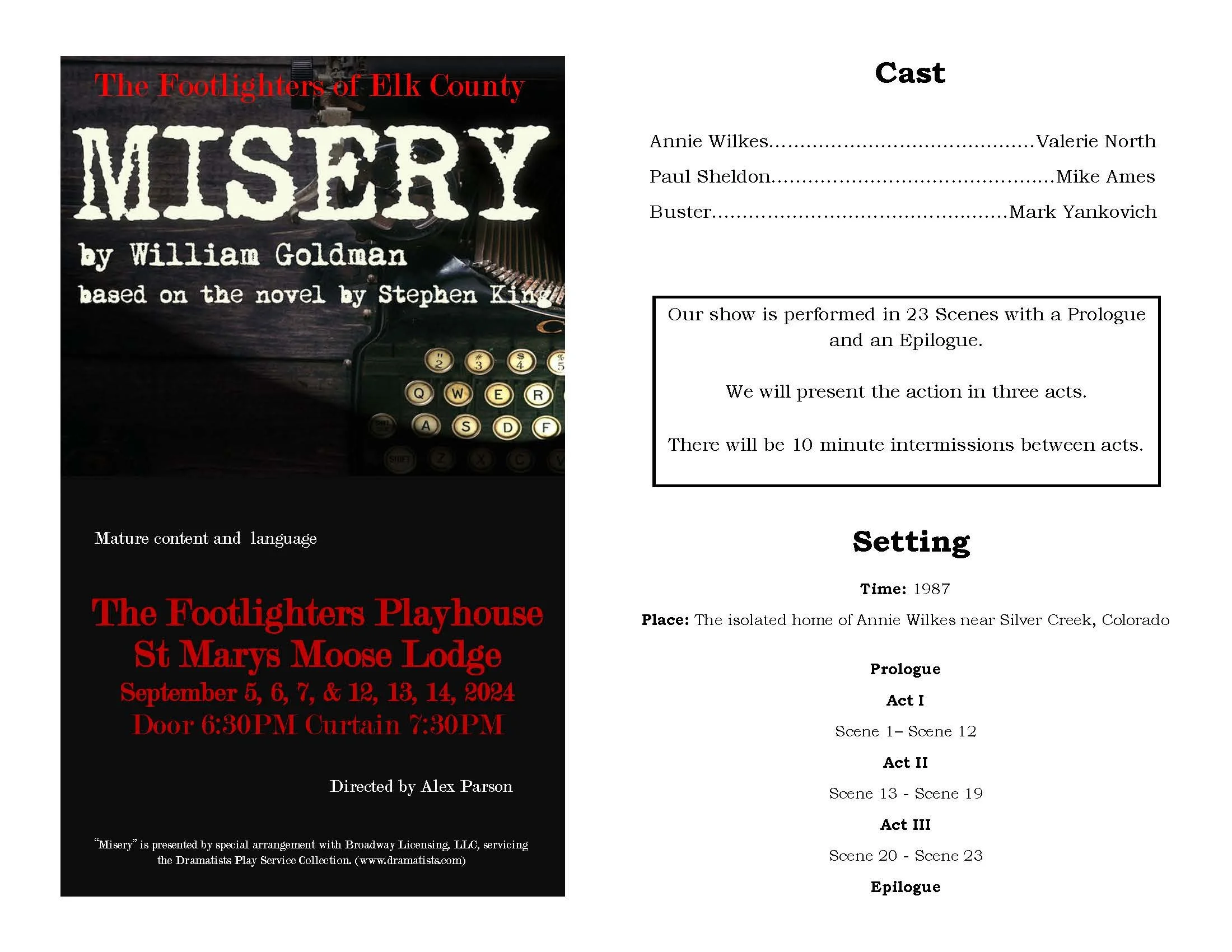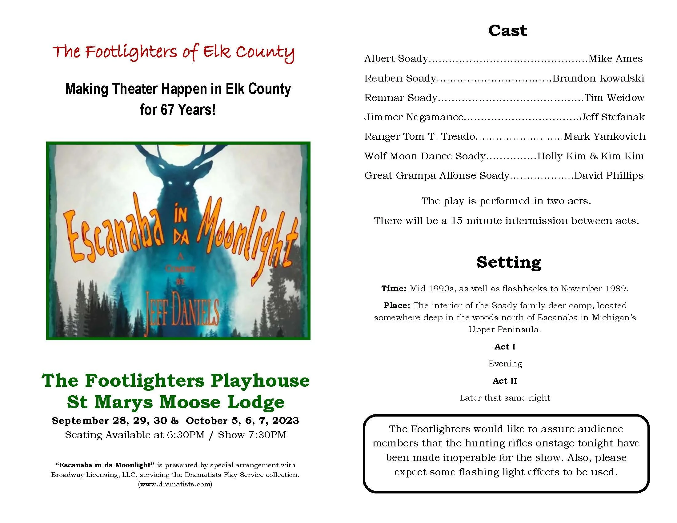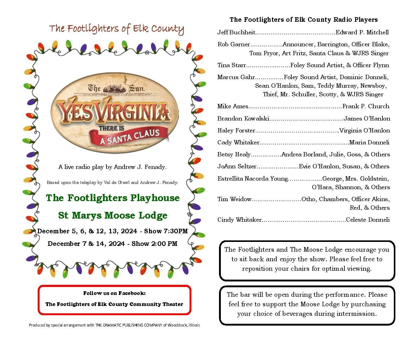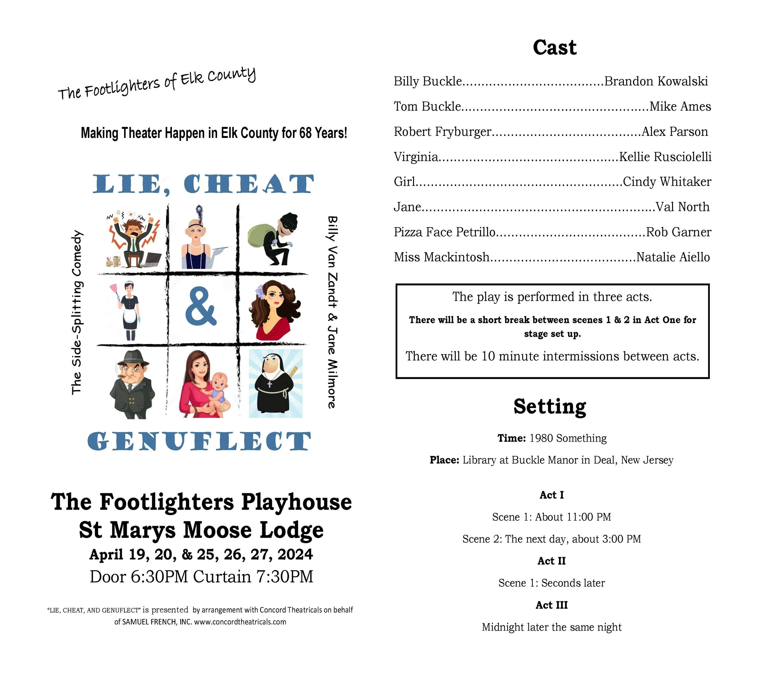 Show Archive 2025 Season View fullsize Don't Talk to the Actors View fullsize Sylvia View fullsize Crimes of the Heart 2024 Season View fullsize Lie, Cheat, Genuflect View fullsize Misery View fullsize The Savannah Sipping Society View fullsize Yes Virginia, There is a Santa Claus 2023 Season View fullsize Don't Dress for Dinner View fullsize Escanaba in Da Moonlight View fullsize The Sweet Delilah Swim Club View fullsize A Christmas Carol 2022 Season View fullsize Love, Lies, & the Doctor's Dilemma View fullsize Murder is a Game View fullsize Over the Tavern 2021 Season View fullsize Jack of Diamonds 2019 Season View fullsize Fox On the Fairway View fullsize It's a Wonderful Life 2018 Season View fullsize Moon Over Buffalo View fullsize The Comedy of the Carol Burnett Show - page 1 View fullsize The Comedy of the Carol Burnett Show - page 2 2017 Season View fullsize Too Many Cooks View fullsize Leaving Iowa - page 1 View fullsize Leaving Iowa - page 2 View fullsize Sex Please We're Sixty 2004 Season View fullsize Our Town